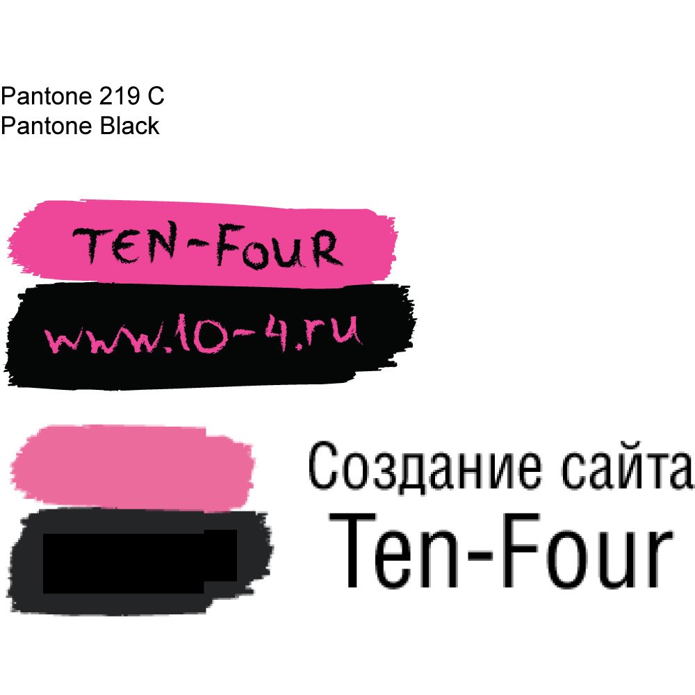 The Ten-Four logo presents a bold, artistic identity for a web development and internet agency, combining expressive brushstroke textures with clean, contemporary typography. The central visual elements are two horizontal paint strokes: an upper band in Pantone 219 C, a vivid magenta-pink, and a lower band in deep Pantone Black. On the pink stroke, the brand name “TEN-Four” appears in a rough, hand-drawn script, while the black stroke carries the website address “www.10-4.ru” in the same lively pink, also rendered in an informal, brush-like handwriting. This combination of painterly streaks and handwritten text establishes a strong, street-art inspired character that differentiates the brand from more conventional, corporate-style digital agencies.