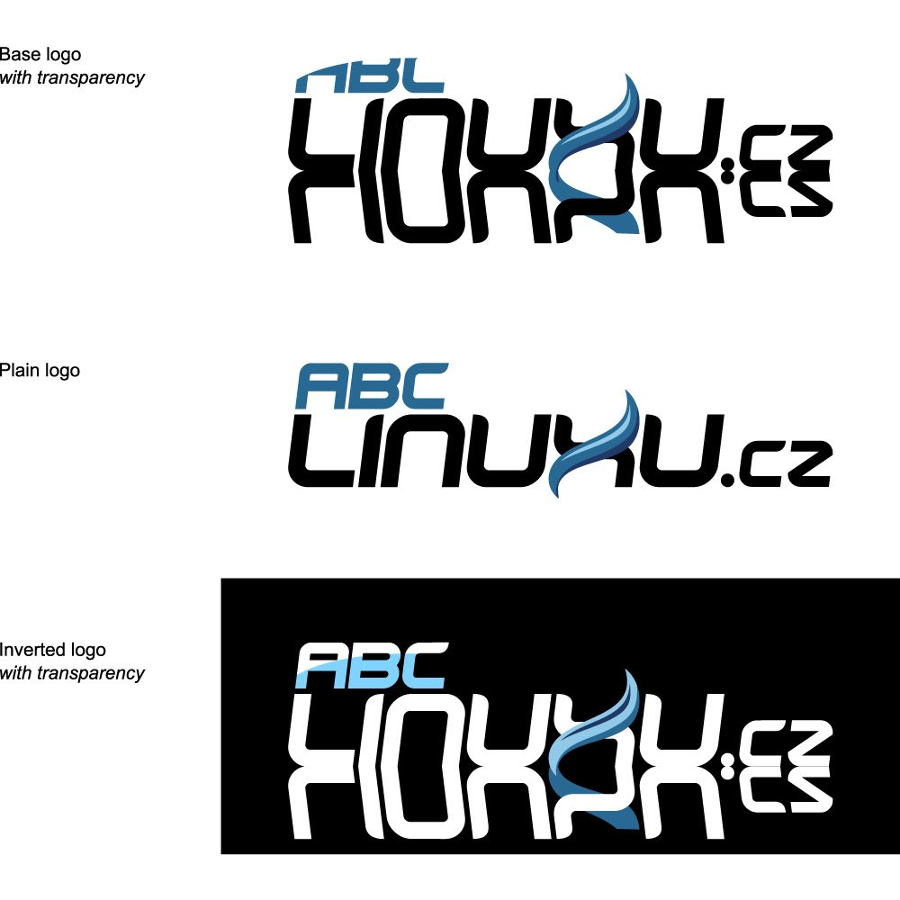 The logo appears in several variants: a base logo with transparency, a plain logo on a white background, and an inverted logo on a black rectangle. These variations highlight the adaptability and versatility of the visual identity, ensuring that Abclinuxu.cz can maintain a consistent presence across websites, dark mode interfaces, printed materials, and promotional banners. In the inverted version, white lettering against a black field provides strong contrast, while the blue accent remains vivid, ensuring recognizability even when the color scheme is reversed. The transparent and plain options fit seamlessly onto web pages and UI elements, a crucial aspect for a technology brand whose primary touchpoint is digital. This modular approach to logo usage mirrors the modular, configurable spirit of Linux distributions and open‑source toolchains.