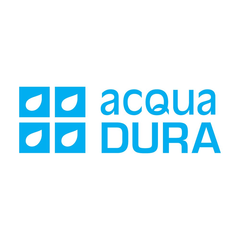 To the right of the emblem, the wordmark "acqua DURA" is rendered in a modern sans‑serif typeface that reinforces the brand’s contemporary positioning. The lowercase treatment of "acqua" conveys accessibility, friendliness and approachability, while the uppercase "DURA" introduces a feeling of strength, reliability and durability. This subtle typographic contrast mirrors the brand’s conceptual balance: water as an element that is both gentle and powerful, flexible yet essential. The rounded forms of the letters, especially the distinctive "q" and "a," echo the curves of the droplet symbol, tying together the logotype and the icon into a cohesive visual system.