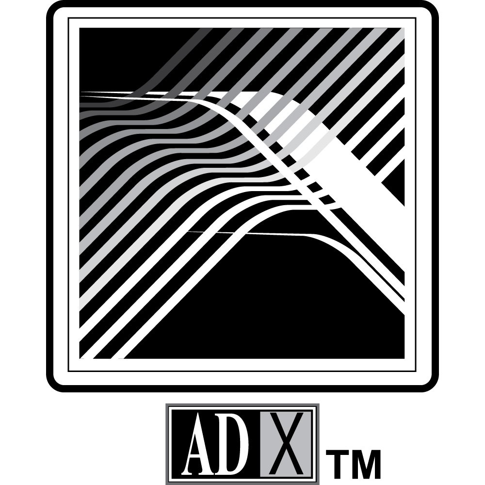 The lower portion of the symbol features darker, more solid shapes that anchor the composition and provide visual weight. These dark fields support the lighter, more dynamic lines above, reinforcing an idea of stability beneath innovation. The double border around the square frame further emphasizes structure and precision, adding a technical edge while still keeping the overall look clean and uncluttered. The typography in the sub‑logo—where “AD” appears in white on a dark ground and the “X” sits in a contrasting gray panel—adds a subtle emphasis to the final letter, hinting at the brand’s focus on crossing boundaries, executing at a high level, or reaching an “X‑factor” standard of performance.