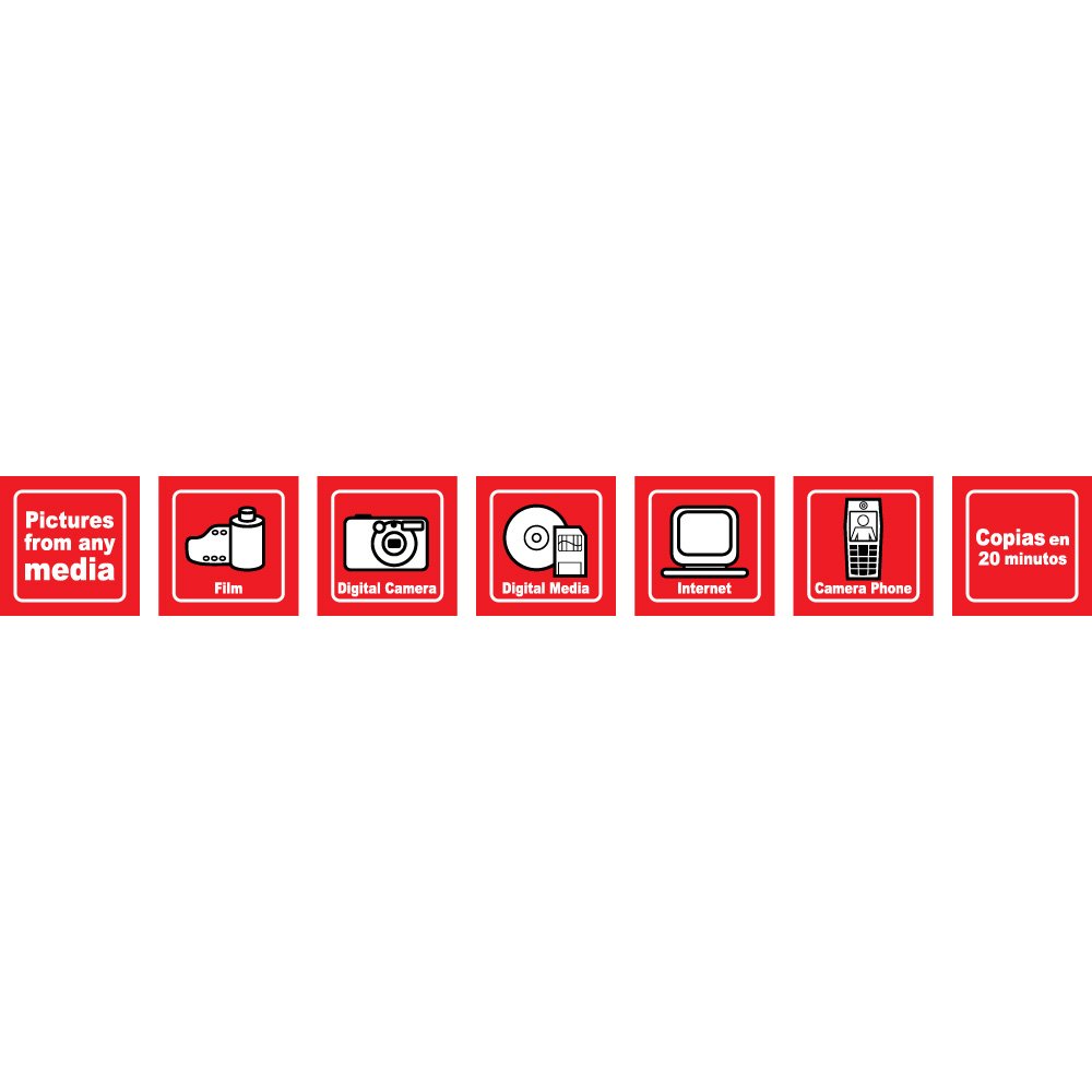 The AgfaPhoto logo vector depicted here showcases a horizontal strip of bright red square icons, each illustrating a different image source and service promise. From left to right, the panels communicate the key message “Pictures from any media,” followed by stylized pictograms for film, digital camera, digital media, internet, camera phone, and a final promise of “Copias en 20 minutos,” or copies in twenty minutes. This visual sequence encapsulates the brand’s role as an accessible photo‑finishing provider capable of handling images from both traditional and digital channels. The bold red background, clean white typography, and simple line‑art illustrations form a cohesive graphic language that is instantly readable at a glance in retail environments.