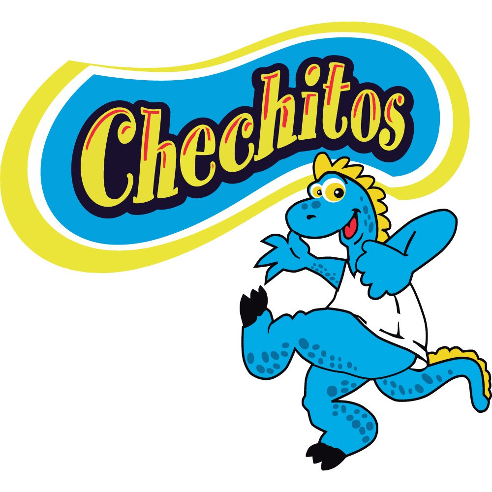 The graphic composition of the logo is carefully balanced. The waving, capsule‑like blue shape that carries the “Chechitos” wordmark visually echoes the motion of the mascot, creating a sense of flow through the design. This asymmetrical form helps the logo feel less rigid and more organic, as if it were a splash or burst of flavor. The combination of curved typography and a fluid background shape avoids any harsh or angular lines, reinforcing the brand’s friendly and approachable character. At the same time, the thick outlines and solid blocks of color ensure that the logo remains highly legible across different sizes and printing techniques, from snack packaging to digital banners and promotional materials.