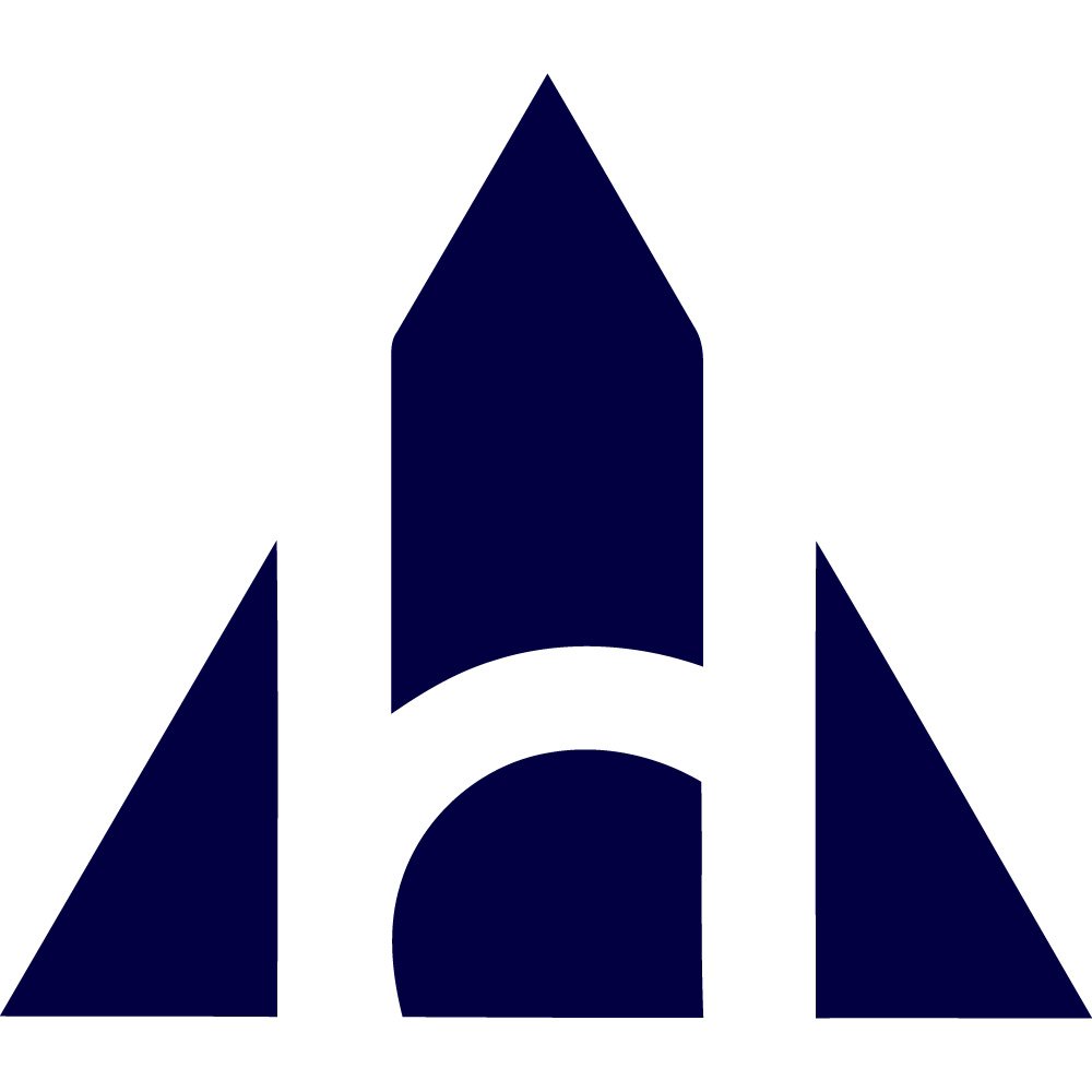 Alchemy Pay is a global payment solutions provider that focuses on bridging the gap between the traditional finance world and the rapidly expanding ecosystem of digital assets. Its logo, shown here in a solid dark blue tone, captures this mission through a carefully balanced composition of geometric shapes that suggest both architectural stability and modern technological dynamism. The mark consists of three prominent triangular and rectangular forms that rise upward like stylized towers, with a clean, curved arch at the base that doubles as a subtle lowercase “a.” This combination merges symbolic references to infrastructure, gateways, and ascent, conveying the company’s role as an on‑ramp and off‑ramp between fiat currencies and cryptocurrencies.