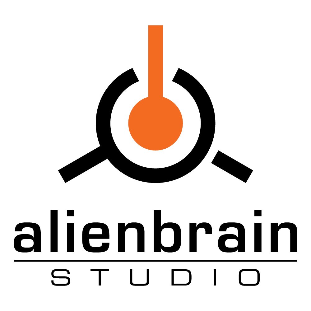 The Alienbrain Studio logo presents a bold and contemporary visual identity that immediately communicates precision, technology, and creativity. At the top of the composition, a circular emblem combines black geometric forms with a vivid orange core, suggesting a fusion of logic and imagination. The circle, partially enclosed by a thick black arc and intersected by angled bars, evokes associations with a stylized head, an abstract eye, or a technological interface. The strong color contrast between the deep black and bright orange gives the mark instant recognizability, making it stand out in digital interfaces, software splash screens, and professional documentation. This emblem serves as a compact symbol that can function independently from the wordmark, ideal for icons, app badges, or small-format branding.