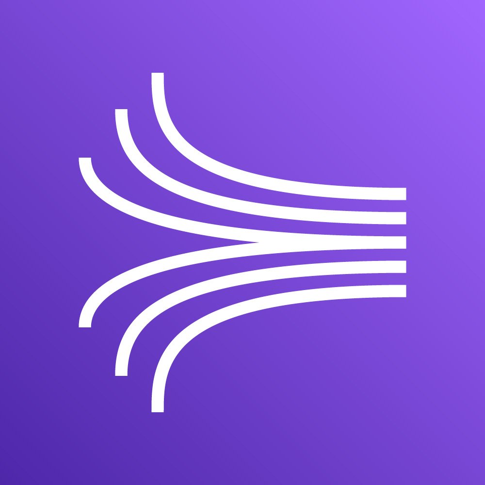 In summary, the Amazon Kinesis logo combines a minimal, modern visual design with a strong conceptual metaphor for data in motion. The curved white lines on a purple background express speed, order, and transformation—key ideas behind any effective streaming data platform. By aligning closely with the broader AWS design language and brand principles, the logo not only identifies a specific service but also reinforces the notion of an integrated, comprehensive cloud ecosystem for real‑time data processing and analytics.