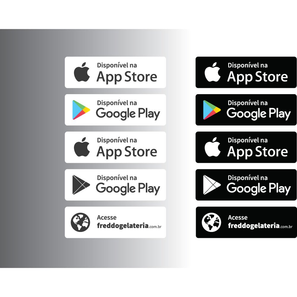 Overall, this logo and badge set communicates accessibility, modernity, and user‑centric convenience. By combining the authority of Apple and Google’s visual languages with a localized Portuguese message and a dedicated domain, Freddo Gelateria reinforces its position as a contemporary, digitally enabled brand. The minimal, uncluttered design gives priority to recognizable icons and clear calls to action, enabling customers to quickly identify where to download the app or visit the website, and strengthening the connection between the physical gelateria experience and its digital extensions.