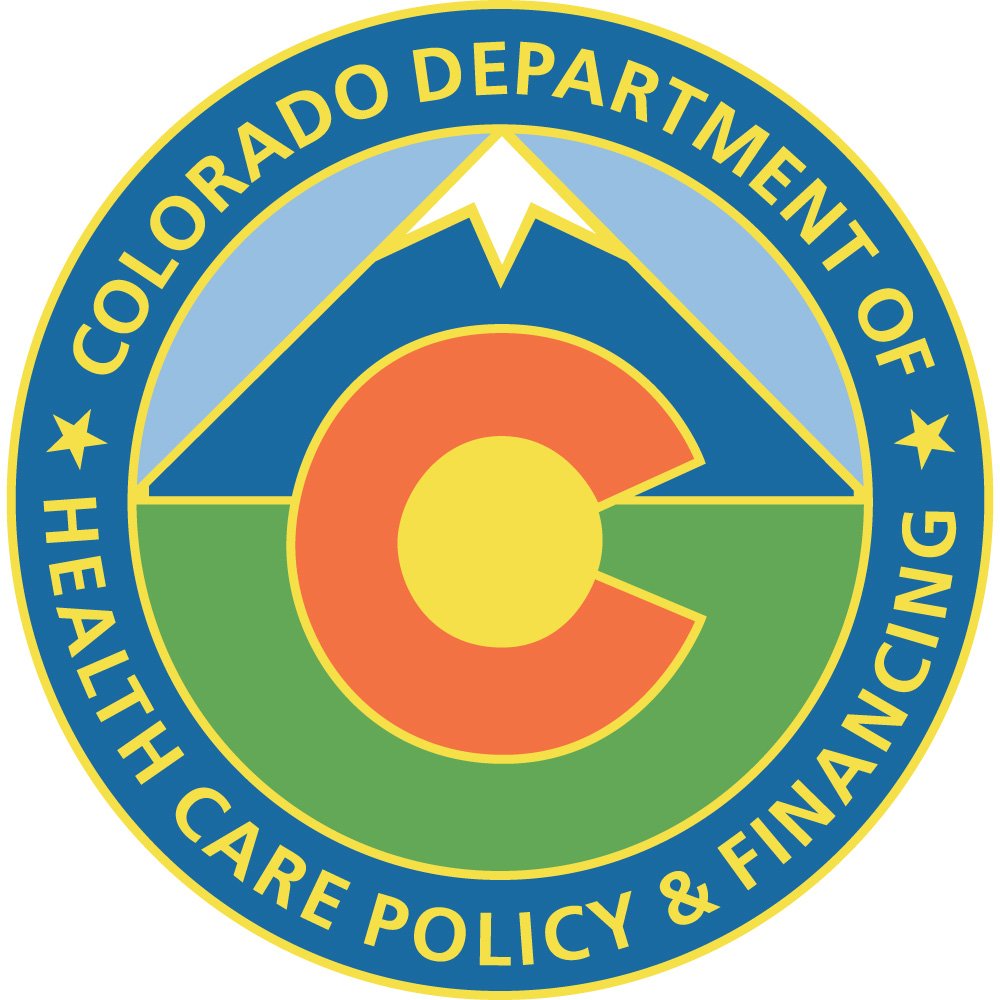 The logo shown is the official emblem of the Colorado Department of Health Care Policy & Financing (HCPF), the state agency responsible for administering public health coverage programs such as Health First Colorado (Colorado’s Medicaid program) and Child Health Plan Plus (CHP+). The circular design immediately communicates governmental authority and continuity with broader state branding, while its color choices and central iconography root the seal firmly in Colorado’s geographic and cultural identity.