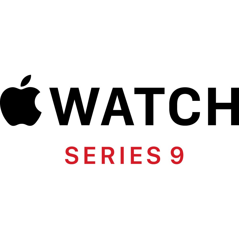 The Apple symbol itself carries decades of design heritage. It is a distilled, geometric shape that communicates sophistication while remaining friendly and approachable. In the Apple Watch Series 9 lockup, the icon precedes the word “WATCH,” reinforcing the idea that the watch is not just another timepiece but a core extension of the broader Apple ecosystem. The stark black color of both the icon and the wordmark conveys reliability, durability, and seriousness of purpose, suggesting that the device is not only fashionable but also a trusted tool for productivity, communication, and wellness. The red “SERIES 9” line adds a product‑specific signature, making it easy to distinguish this generation from previous ones while hinting at performance, vitality, and forward momentum.