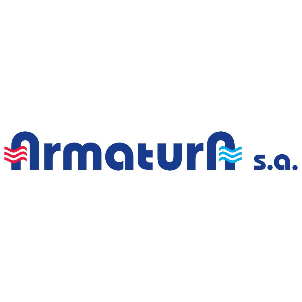 The Armatura S.A. logo presents a contemporary wordmark that emphasizes clarity, reliability, and a strong connection with water-related products. Rendered in a deep, confident blue, the main "Armatura" inscription uses a rounded, geometric typeface that conveys modern engineering precision while remaining friendly and approachable. The initial and final letters are stylized with arched vertical strokes that form a distinctive gateway-like shape, subtly suggesting the flow of water through pipes, valves, and fittings. Integrated into these arched segments are dynamic wave symbols, executed in contrasting red on the left and light blue on the right, which introduce movement and symbolize the brand’s intimate relationship with water systems, fluid control, and sanitary technology.