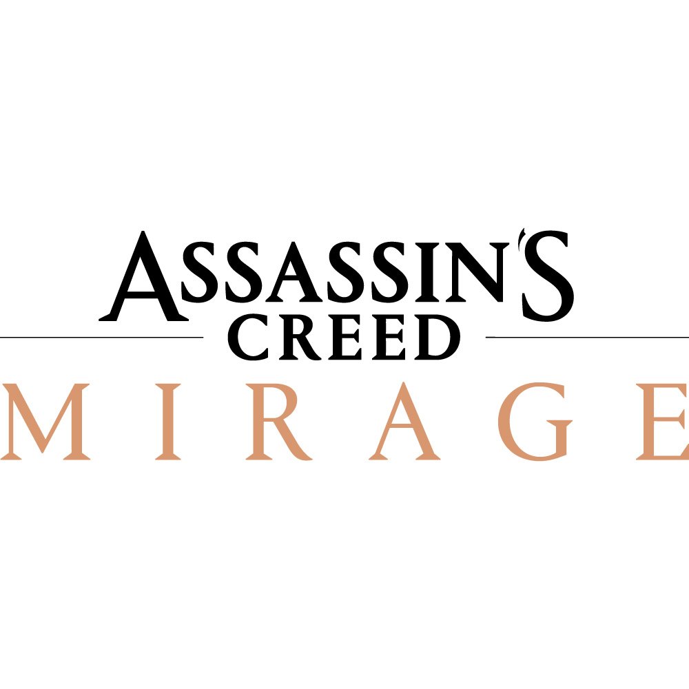 Color choice plays a central role in this wordmark. The use of black for “ASSASSIN'S CREED” asserts authority, tradition, and seriousness, mirroring the franchise’s themes of secretive brotherhoods and long‑running ideological conflict. The beige, almost copper‑tinted hue of “MIRAGE” introduces warmth and regional flavor, hinting at a setting inspired by Middle Eastern or North African environments, where light, dust, and heat shape visual perception. By relying on a simple two‑color palette, the logo remains versatile for use across box art, marketing materials, merchandise, and digital storefronts, while still carrying narrative weight. This balance between functional clarity and atmospheric suggestion is a hallmark of strong entertainment branding.
