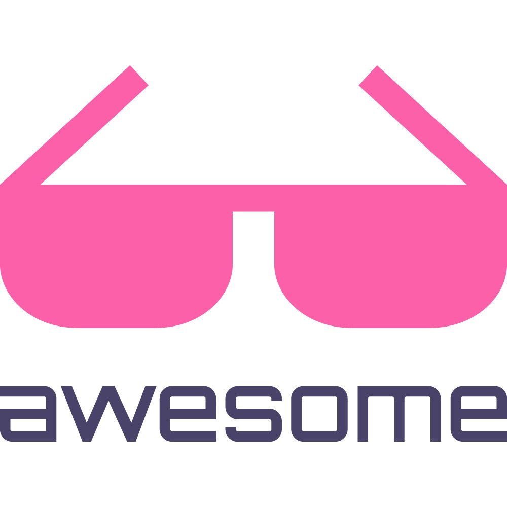 The logo features a bold, stylized pair of sunglasses rendered in a vibrant pink color, positioned above the lowercase wordmark “awesome” in a deep, muted purple. The design is minimal, geometric, and instantly recognizable, fusing playful creativity with a clean, tech-forward sensibility. The striking contrast between the neon-like pink glasses and the calm, confident purple typography creates a visual balance that is both energetic and trustworthy, reflecting a brand that aims to be fun yet reliable.