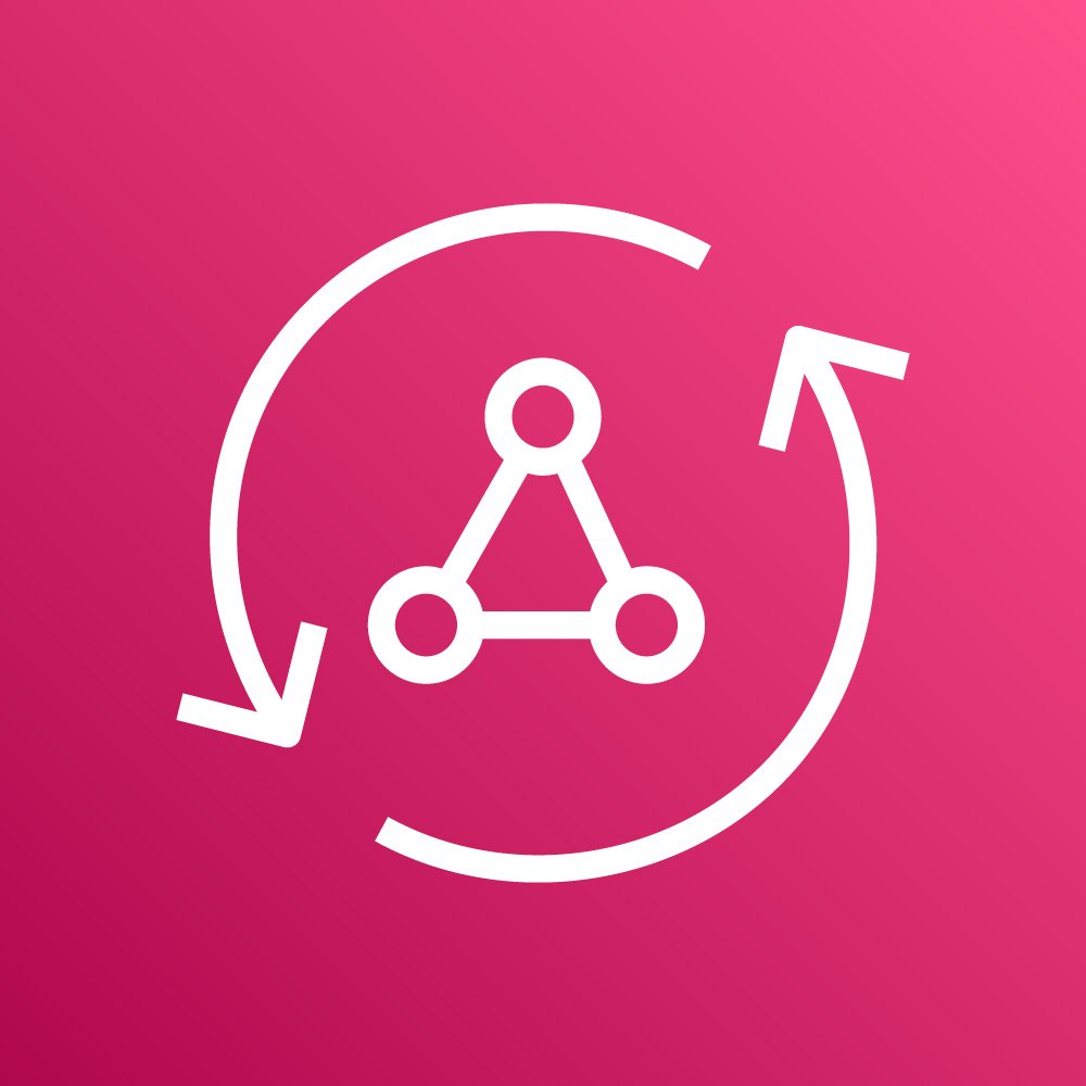 The AWS AppSync logo represents Amazon Web Services’ fully managed GraphQL service, designed to simplify the development of data-driven applications that require real-time updates and seamless synchronization across devices. The logo features a stylized triangular node structure formed by three connected circles, encapsulated by a pair of circular arrows that suggest continuous flow and data refresh. Set against a vibrant pink to magenta gradient background, the white line art stands out clearly, conveying clarity, connectivity, and constant motion. This distinct color treatment helps AppSync stand apart within the AWS product family while still aligning with the broader visual language of AWS service icons.
