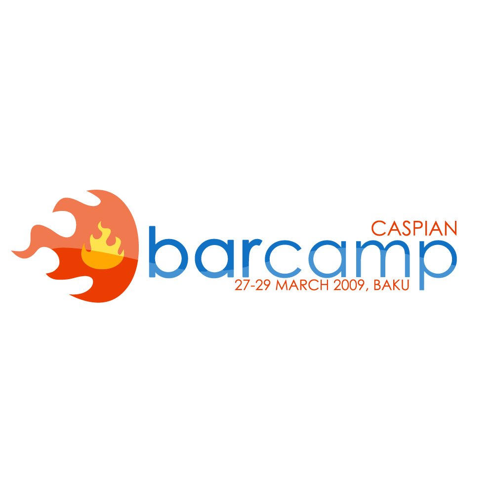 Above the “p” at the end of “barcamp,” the word “CASPIAN” appears in uppercase red letters in a more condensed, modern typeface. This creates a visual anchor that specifies the regional focus of this particular Barcamp, tying the global Barcamp concept to the Caspian area. The red color harmonizes with the orange and red hues of the flame, making the regional designation feel fully integrated into the overall identity. Beneath the “barcamp” wordmark, an additional line of text reads “27–29 March 2009, Baku” in the same red type, clearly indicating the dates and location of the event in Baku, the capital city of Azerbaijan. This event‑specific information positions the logo not only as a brand mark but also as a commemorative emblem for a specific edition of Barcamp Caspian.