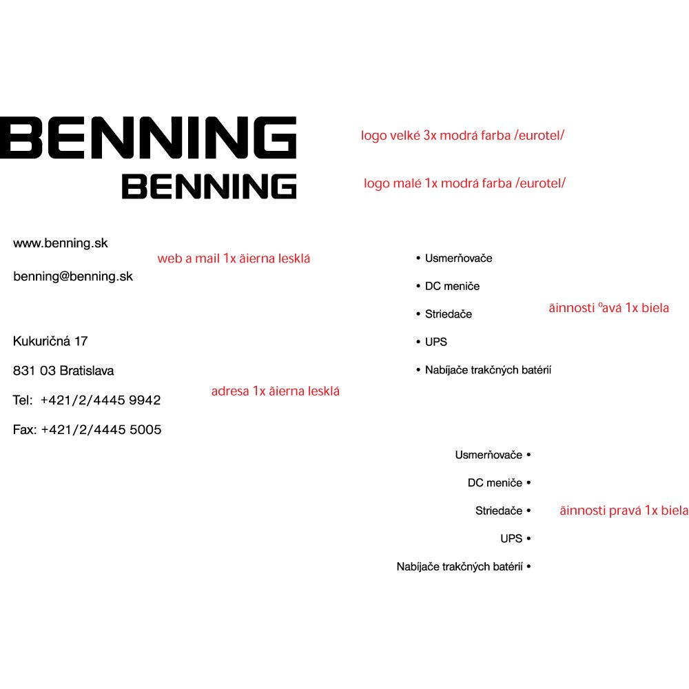 In the context of the design layout, the Benning brand mark is accompanied by key corporate information such as the company’s web address, email contact, physical address, and telephone and fax numbers. This practical, information‑rich arrangement underscores the company’s orientation toward business customers, project partners, and service relationships. The typography used for the contact data is simple and modern, complementing the logotype without distracting from it. Notations in red text provide instructions regarding colors and finishes for printed materials, such as specifying where black glossy text should appear and how many times certain elements should be reproduced. These annotations give insight into Benning’s corporate design guidelines and the level of detail with which its visual identity is managed across communications.