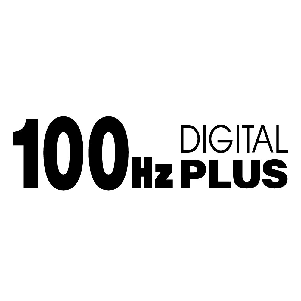 The “100 Hz Digital Plus” logo is a clean, typographic mark that communicates precision, speed, and technological enhancement. Rendered entirely in black on a white background, the logo relies on strong contrasts and clear hierarchy rather than decorative elements. The largest and most dominant component is the number “100,” set in a bold, heavy sans‑serif typeface. This numeric emphasis instantly draws the eye and signals that the key value proposition of the technology or product is related to the 100 Hz performance benchmark. In visual design, large numerals in bold weight are often used to suggest robustness, power, and confidence, and that logic is clearly at work here.