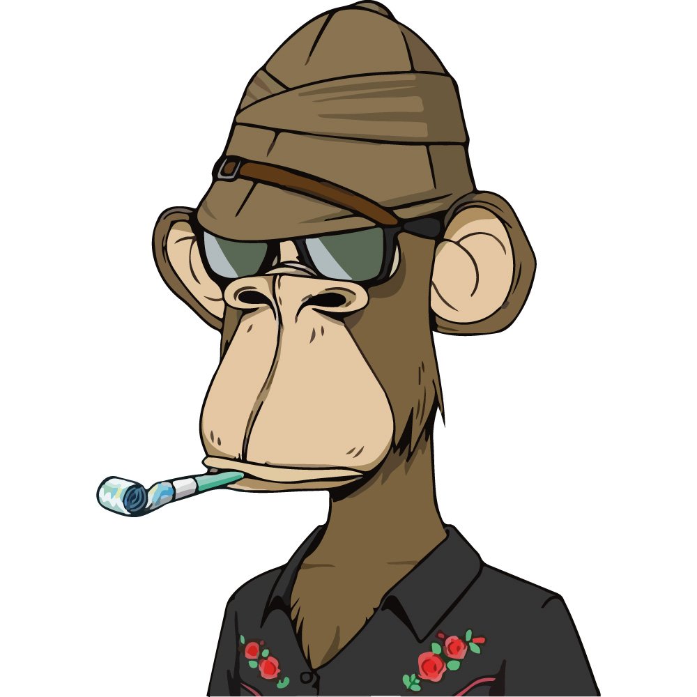 As a logo and avatar, this Bored Ape design functions as both a visual trademark and a digital identity token. In the broader context of NFT collections, each ape is generated through combinations of traits such as headgear, eyewear, clothing, and accessories, giving rise to a vast set of unique but stylistically consistent characters. The specific combination seen here—a safari‑style cap, reflective sunglasses, and a dark shirt with red floral detailing—evokes a laid‑back adventurer or world‑weary traveler, reinforcing the narrative that these apes inhabit an exclusive, members‑only club. The vector format ensures that the artwork remains crisp at any scale, whether used as a tiny social media avatar or enlarged for merchandise, posters, and digital displays.