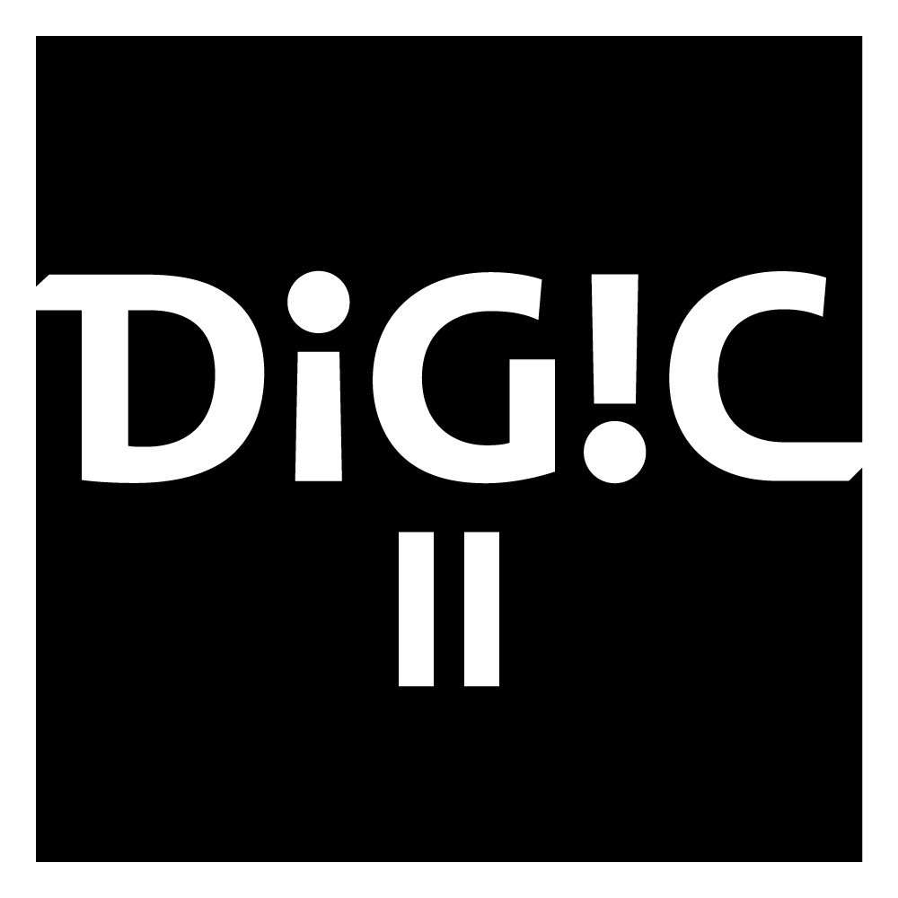 The Canon DIGIC II logo represents the second generation of Canon’s proprietary DIGIC (Digital Imaging Integrated Circuit) image-processing engine, a core technology that powered a wide range of the company’s digital cameras and DSLRs in the mid‑2000s. The logo features the stylized word “DiG!C” with an exclamation mark replacing the letter “I,” set within a bold black square and accompanied by the Roman numeral “II” beneath it. This compact, high‑contrast design visually communicates precision, high performance, and the tightly integrated nature of Canon’s imaging electronics. By isolating the wordmark in white against a solid black field, Canon emphasizes clarity and technical rigor, reflecting the role of the DIGIC II processor as the “brain” behind image capture, color reproduction, and overall camera responsiveness.