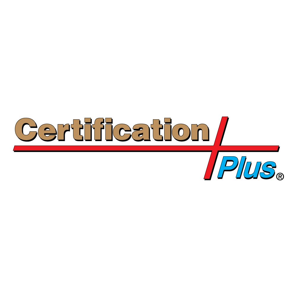 To the right, the word “Plus” appears in a bright blue tone, contrasting sharply with the tan of “Certification” and the red of the crossbar. The blue is vibrant and modern, conveying innovation, technology, and forward‑looking thinking. Its slight italicization creates a sense of movement and progress, subtly implying that the brand goes beyond standard certification, offering something extra—whether that is added support, resources, or higher‑value outcomes. The shift in color and style between “Certification” and “Plus” emphasizes that second word as a differentiator: not just certification, but certification plus something more.