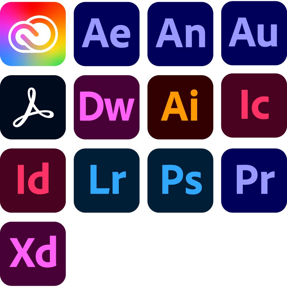 From a brand strategy perspective, this suite of icons functions as a visual shorthand for the company’s leadership in creative software. Each abbreviation tile acts as a micro‑brand, building loyalty among users of a specific tool while reinforcing recognition of the overarching platform. Designers and artists often identify themselves by their preferred tools, and these two‑letter marks have become badges of professional identity shared in portfolios, tutorials, and online communities. The consistent iconography helps sustain that culture and turns the software into an instantly recognizable symbol of creative expertise.