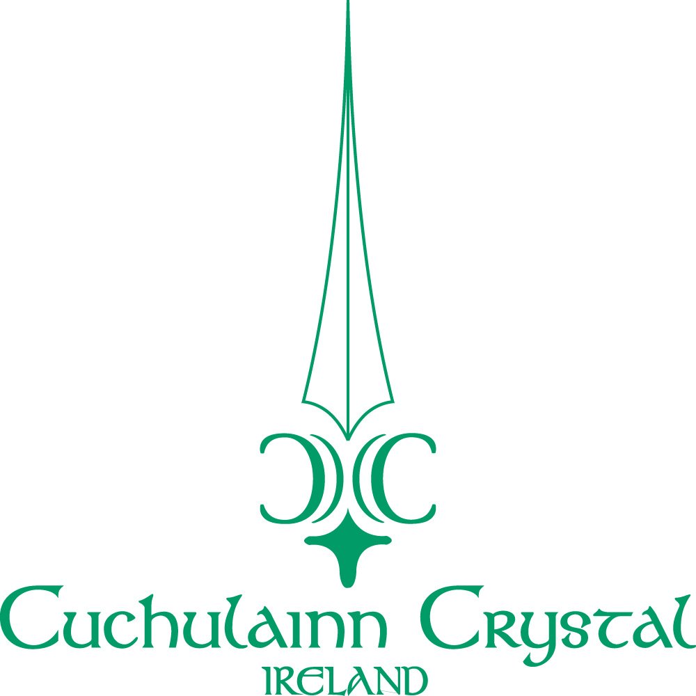 The vertical emblem at the top is particularly striking. Formed by a set of slender, tapering lines, it suggests the sharp, precise facets of fine crystal. The lines converge at a fine point, giving the impression of height, clarity, and focus—qualities often associated with premium glass and crystal cutting. At the same time, the shape carries an echo of a spear or sword, subtly referencing the legendary Irish hero Cú Chulainn, from whom the company takes its name. This dual reading—crystal shard and heroic weapon—creates a layered narrative: the logo not only stands for elegant homeware, but also connects to myth, bravery, and Irish cultural memory.