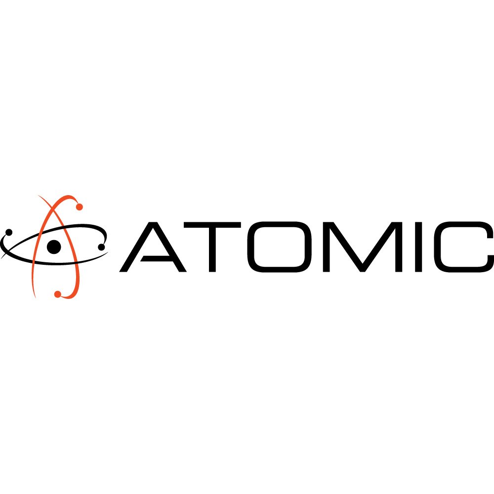 The typography of the word “ATOMIC” is equally important to the identity. The letters are set in an all‑caps format with generous spacing, which contributes to a feeling of clarity and high‑end design. The font is geometric and slightly extended horizontally, suggesting speed and streamlined performance. The clean lines of the letters align well with the precise curves of the atomic symbol, so the entire mark feels cohesive and intentional rather than a random pairing of icon and text. The choice of black for the text reinforces legibility and authority; it ensures the name remains dominant even when the icon draws initial attention.