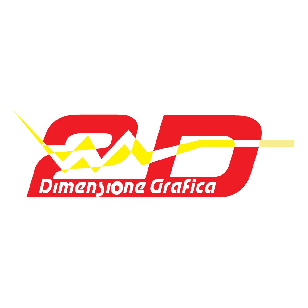 The design also functions well as a stand‑alone emblem. The large "2D" combined with the yellow strike can, by itself, serve as a compact icon for social media avatars, business cards, or merchandising applications such as T‑shirts, stickers, and vehicle graphics. Meanwhile, the full version with the "Dimensione Grafica" wording communicates the company’s specialty more clearly and is suitable for formal uses like invoices, contracts, and stationary. Because the logo is largely vector‑friendly—constructed from simple shapes, solid colors, and clear lines—it scales cleanly in both small and large formats and can be easily adapted for vinyl cutting, screen printing, and digital plotting.