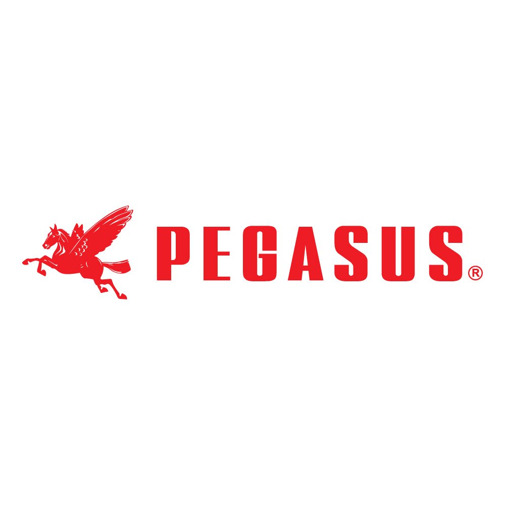 The wordmark “PEGASUS” is set in a robust sans‑serif typeface, with each letter rendered in uppercase for maximum visual impact and legibility. The letters are evenly spaced and proportioned, conveying balance, confidence, and modernity. The red color of the typography mirrors that of the emblem, unifying the composition and creating a cohesive identity system. The use of a sans‑serif style underscores qualities such as clarity, efficiency, and technical reliability, while the solid weight of the characters suggests strength and durability. The registered trademark symbol placed near the wordmark reinforces the idea that this logo is a protected brand asset, recognized and established within its market.